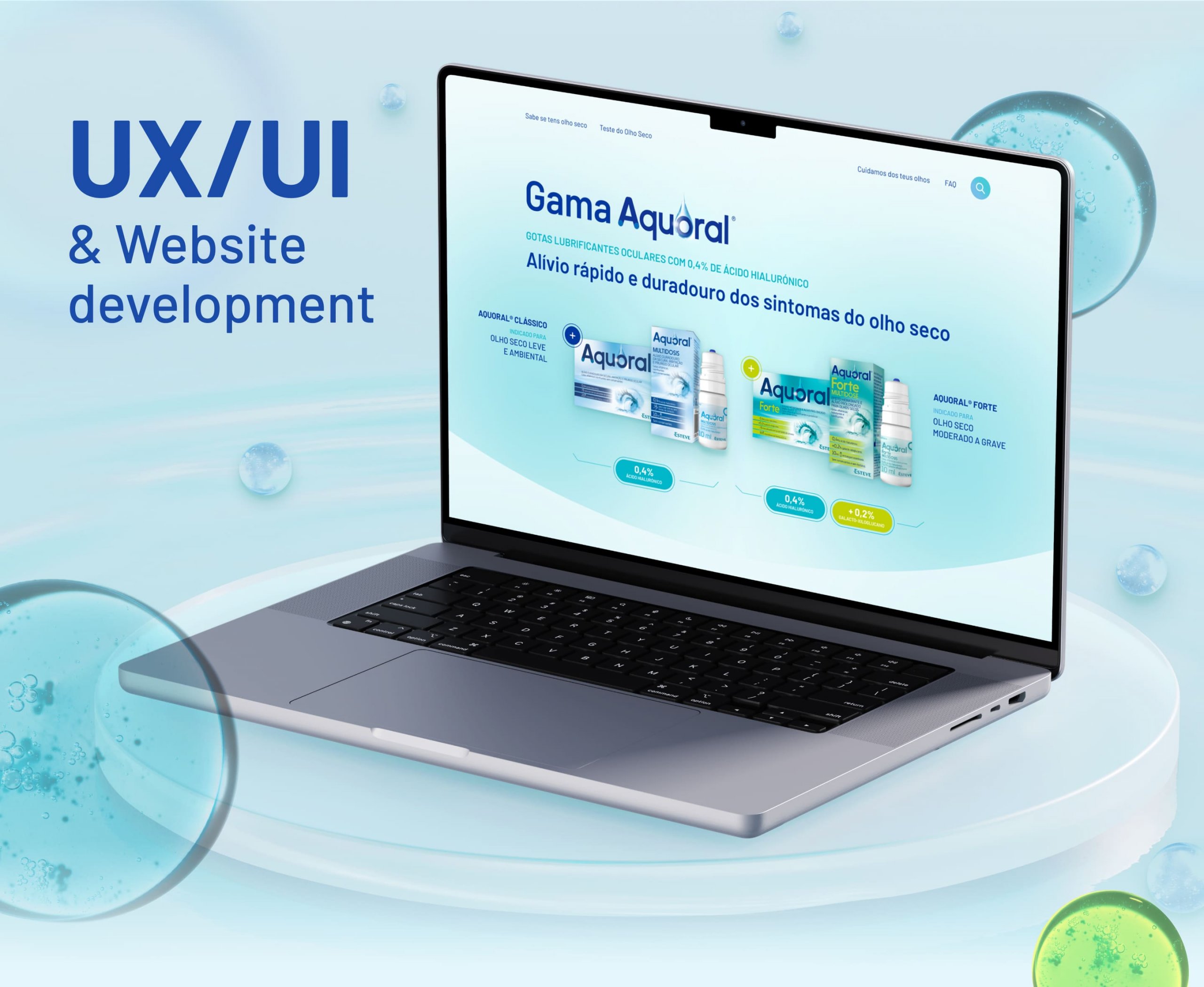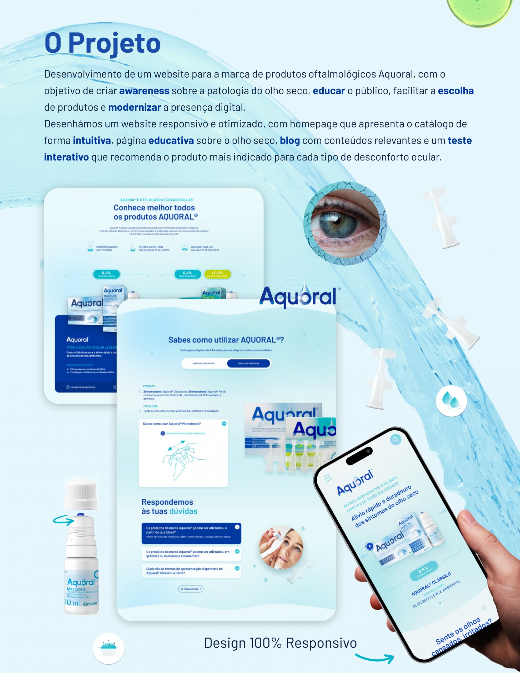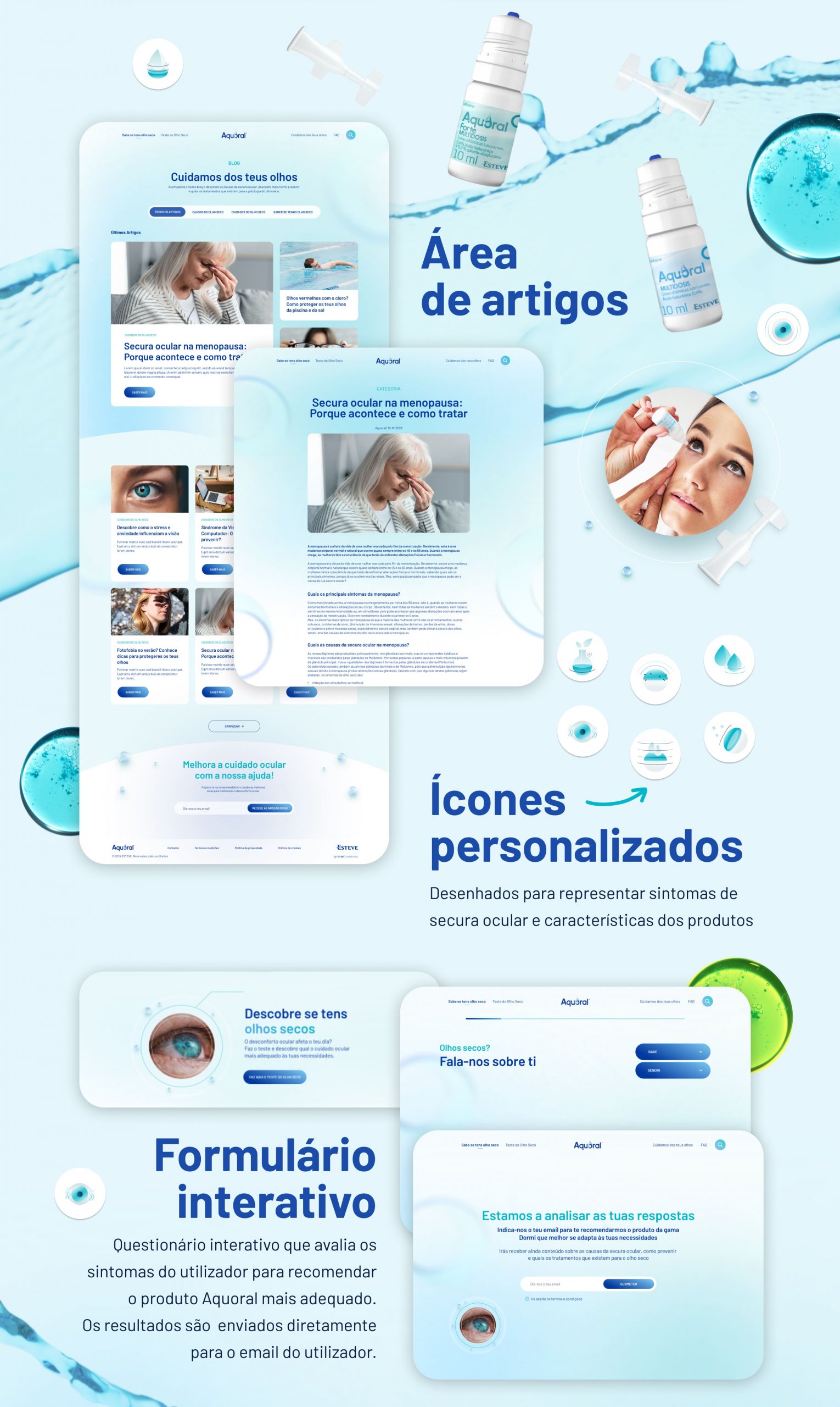 Apresentar produtos da melhor forma passa por ter um website dedicado e cuidadosamente desenvolvido. Foi com este objetivo que a Esteve nos desafiou a criar um site exclusivo para a sua gama de cuidado ocular Aquoral®. Desenvolvido em WordPress, o website destaca os produtos Aquoral® Clássico e Aquoral® Forte através de uma interface clean, intuitiva e acessível, oferecendo ainda informações e dicas práticas para identificar e prevenir a secura ocular.