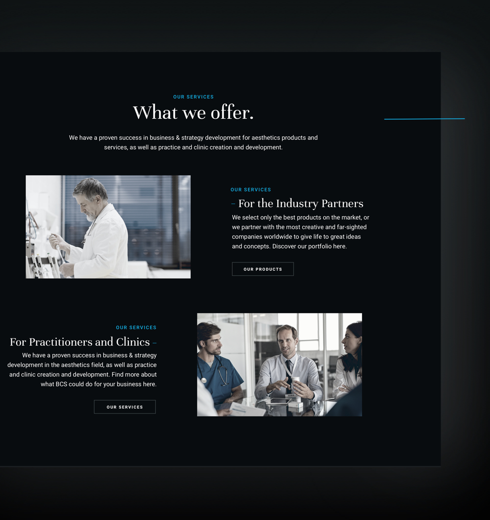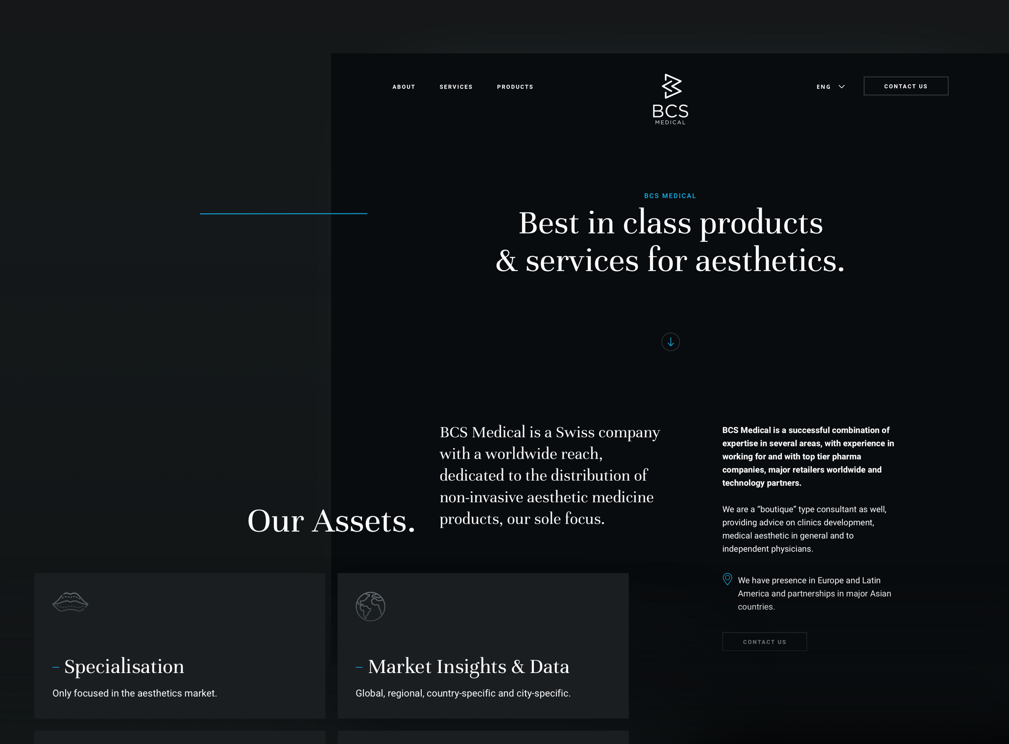 A BCS Medical é uma empresa suíça dedicada à distribuição de produtos de medicina estética não invasivos, com experiência em trabalho com as principais empresas farmacêuticas e parceiros de tecnologia.