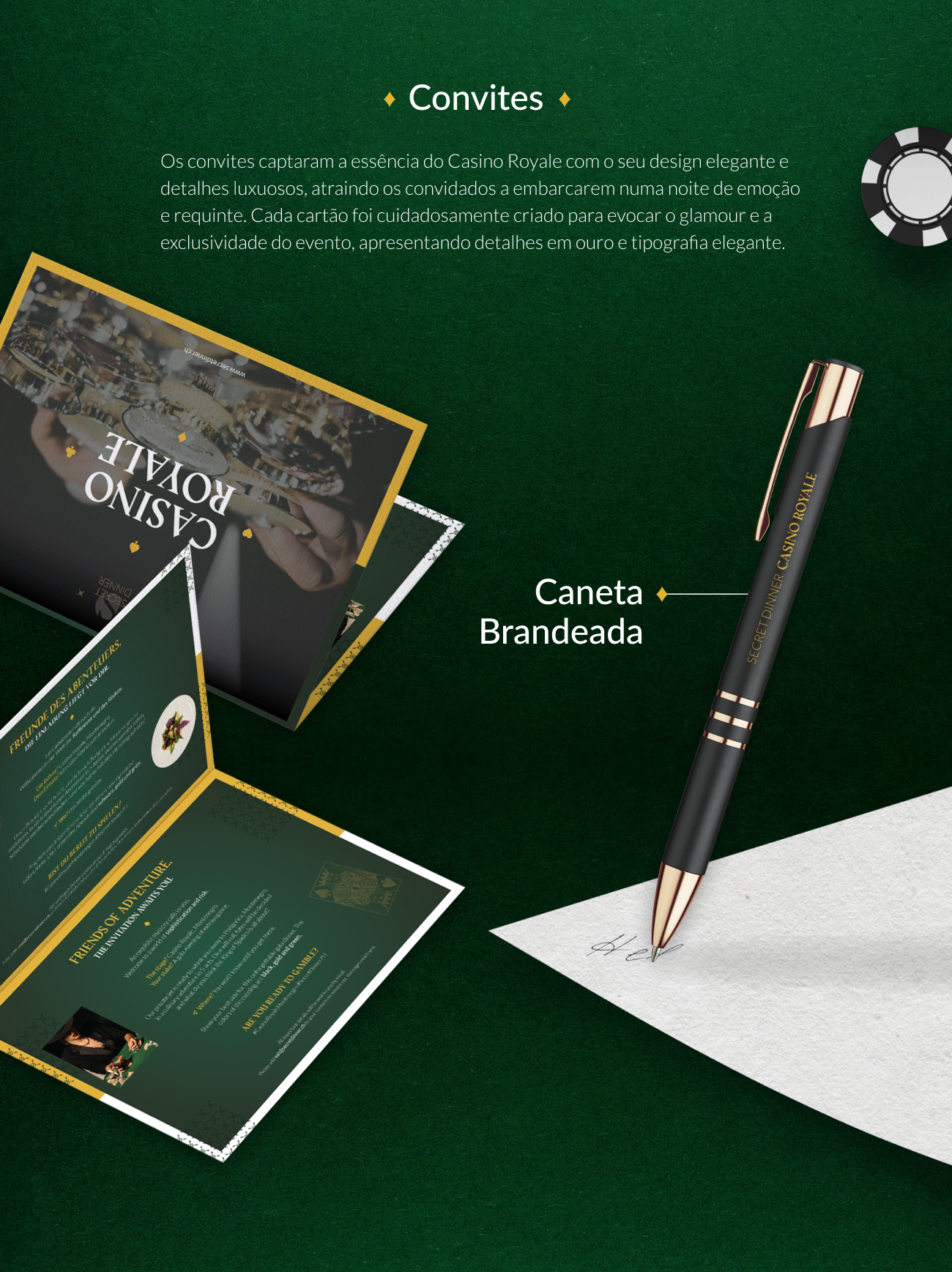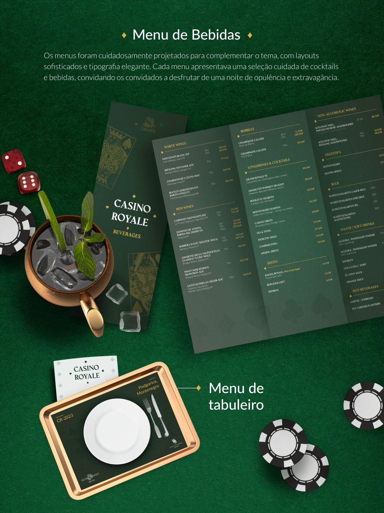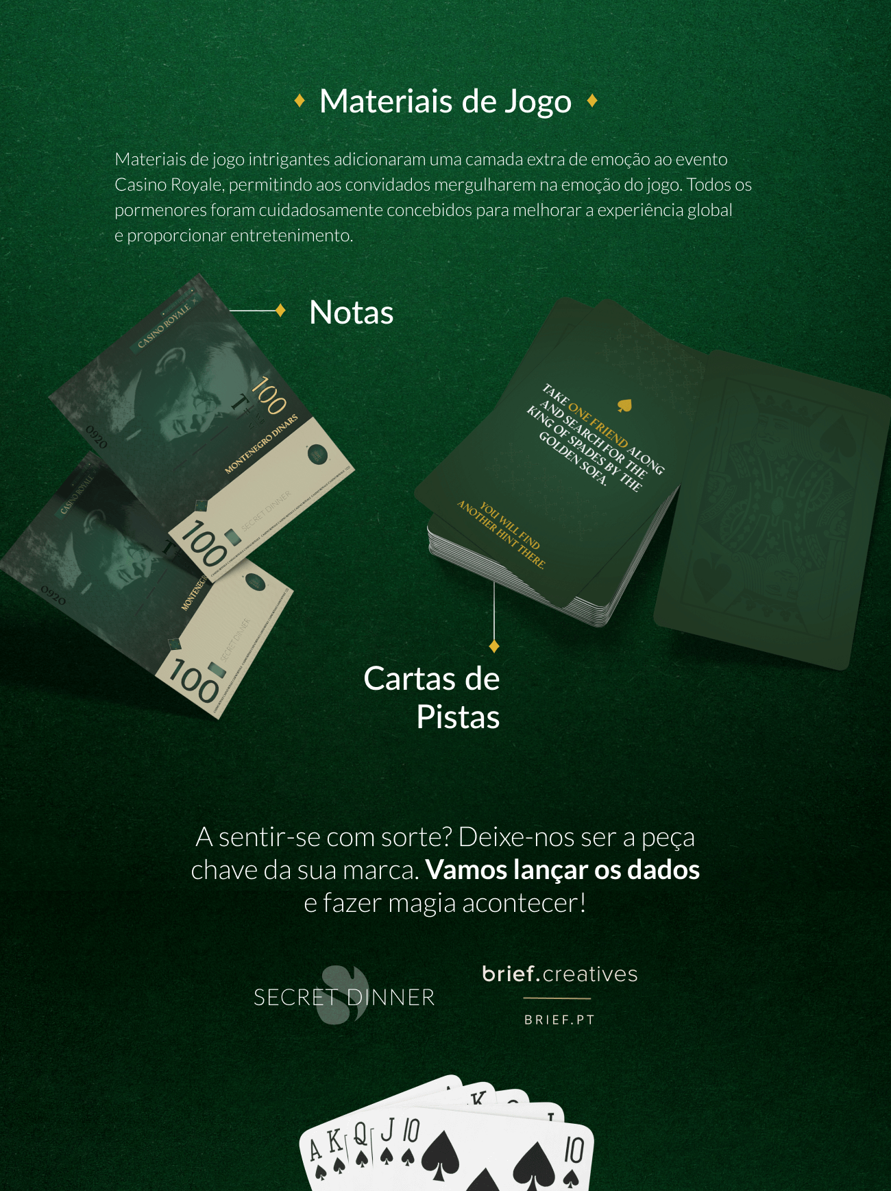 Entra no universo de mistério, intriga e altas apostas com o evento Casino Royale da Secret Dinner! Prepara-te para uma noite de glamour, emoção e mistério. A Brief teve o prazer de dar vida à visão deste evento, acrescentando sofisticação e fascínio a todos os seus aspetos. Preparado para lançar os dados e experienciar a maior das emoções?