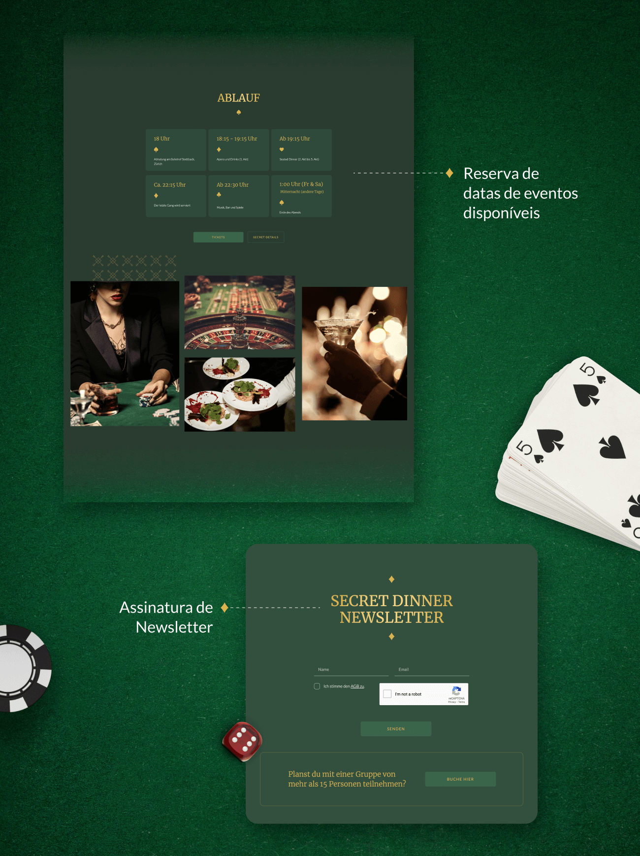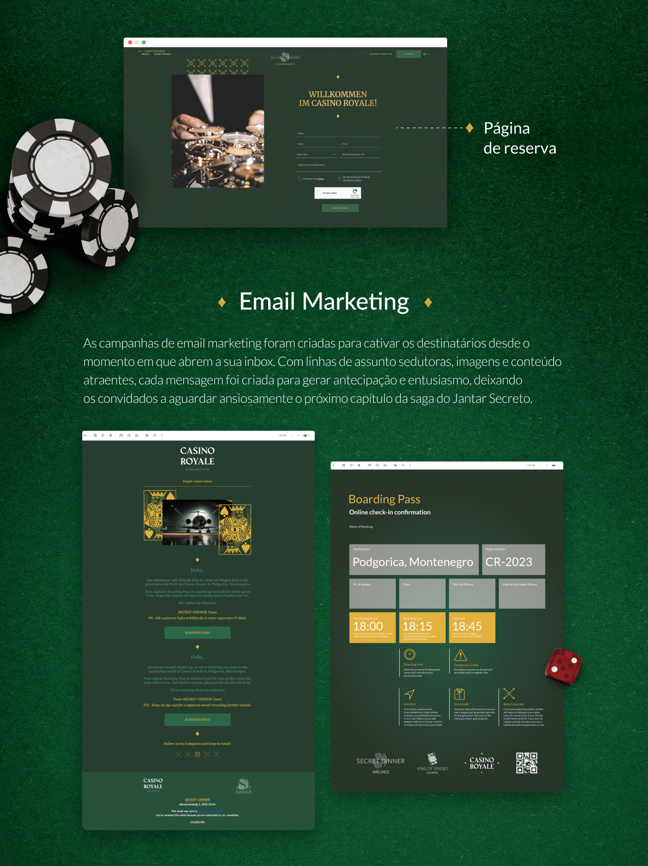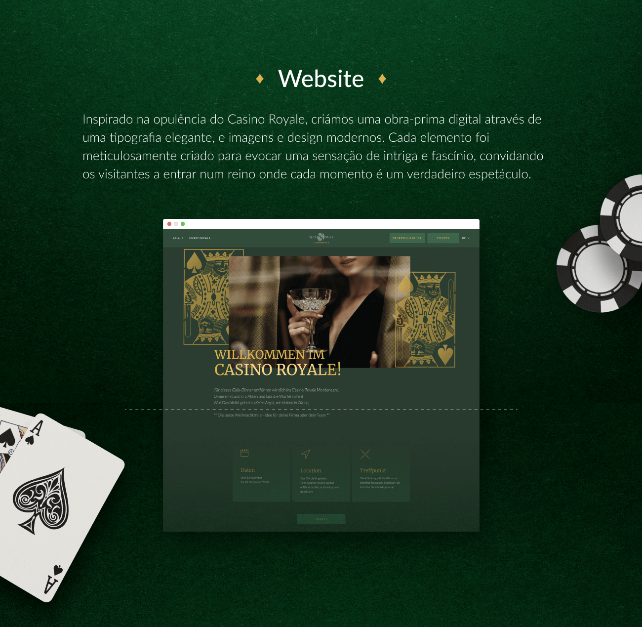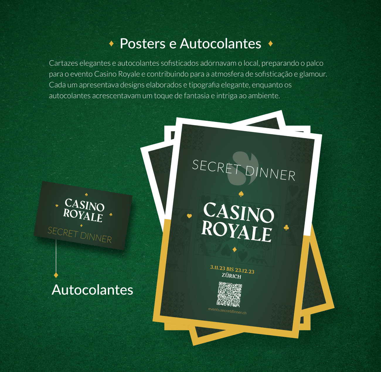 Entra no universo de mistério, intriga e altas apostas com o evento Casino Royale da Secret Dinner! Prepara-te para uma noite de glamour, emoção e mistério. A Brief teve o prazer de dar vida à visão deste evento, acrescentando sofisticação e fascínio a todos os seus aspetos. Preparado para lançar os dados e experienciar a maior das emoções?