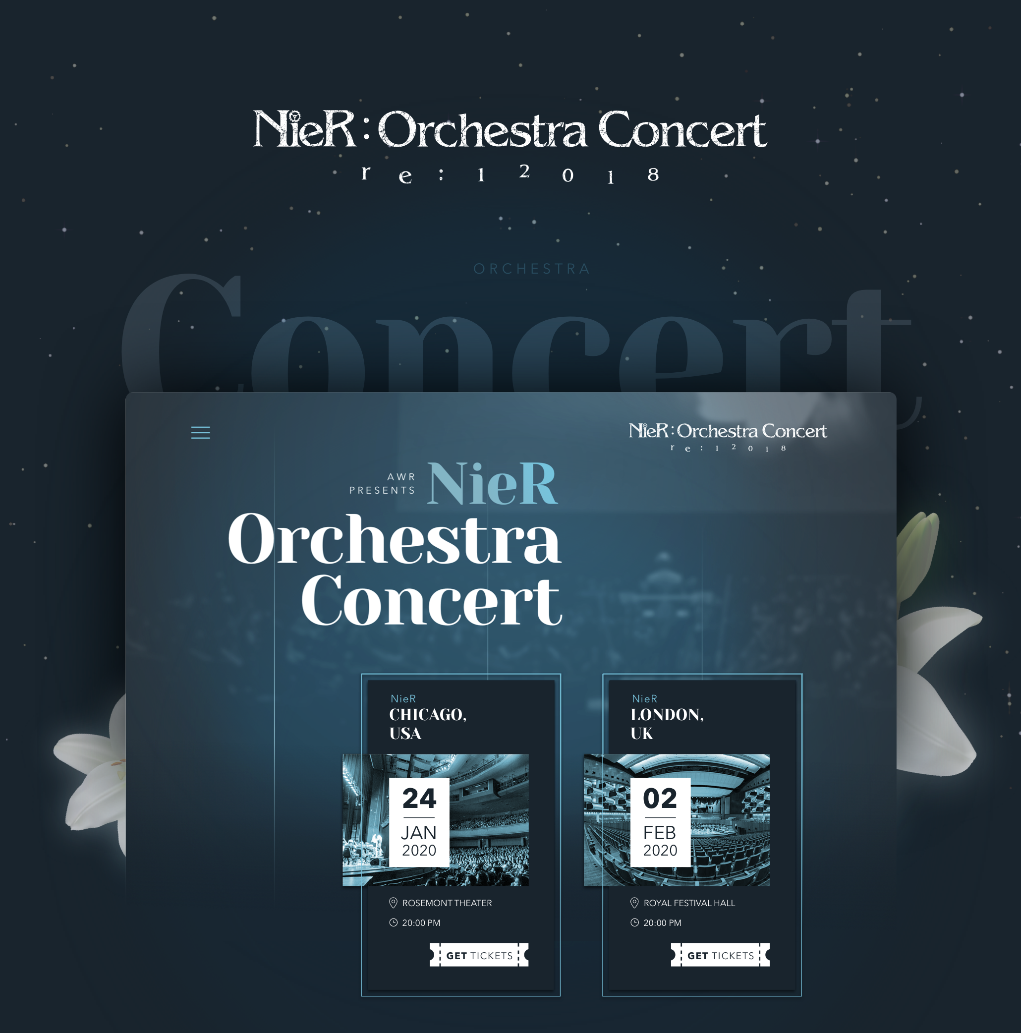 Tivemos mais uma vez o privilégio de trabalhar com a produtora AWR no desenvolvimento do website do seu recente espetáculo “Nier Orchestra Concert”, com a banda sonora do videojogo “Nier”. Baseando-nos na atmosfera visual do videojogo e no conceito da orquestra para melhor representar a experiência dos espetáculos, criámos uma landing page que informa sobre o conteúdo e as datas dos próximos concertos.