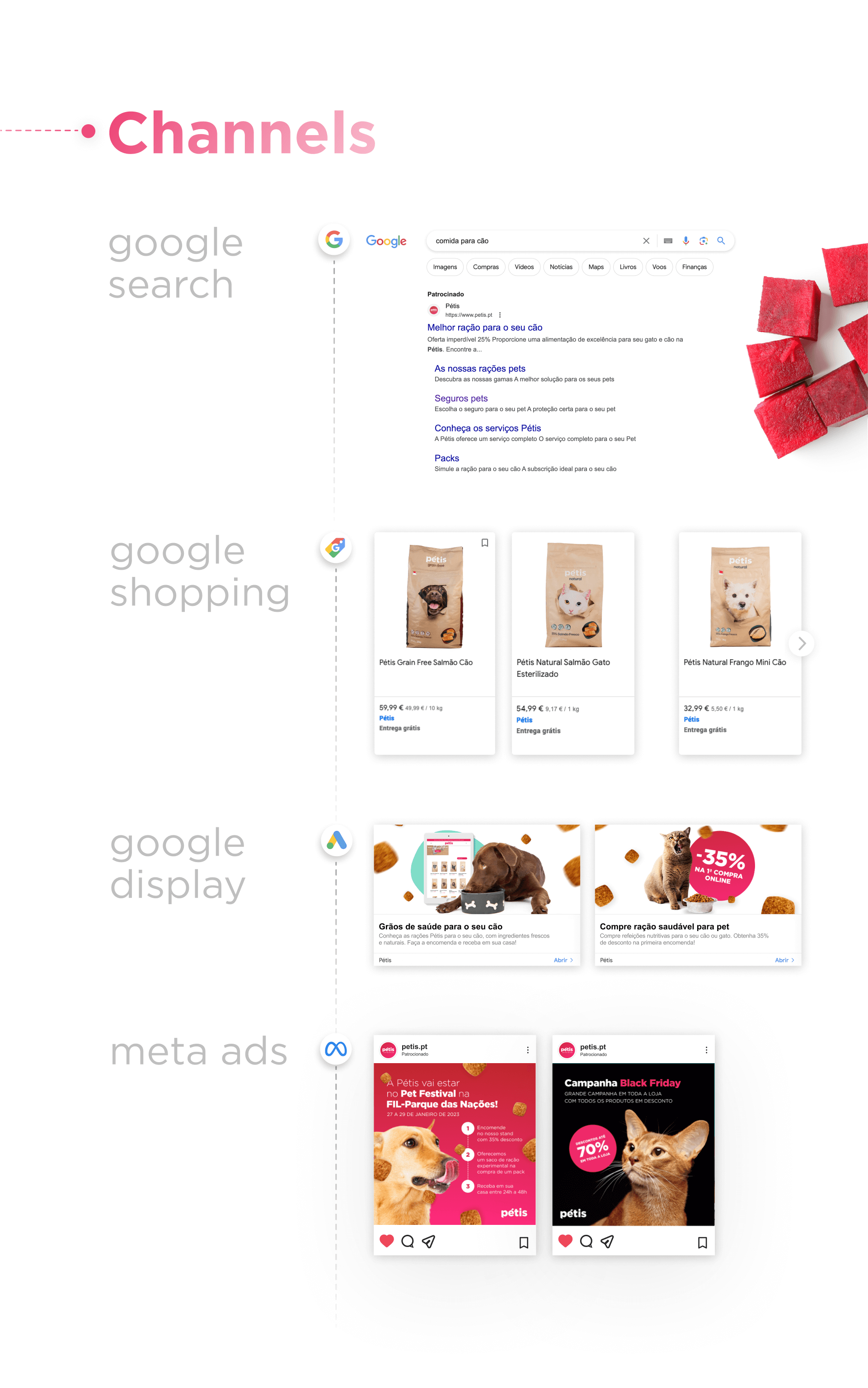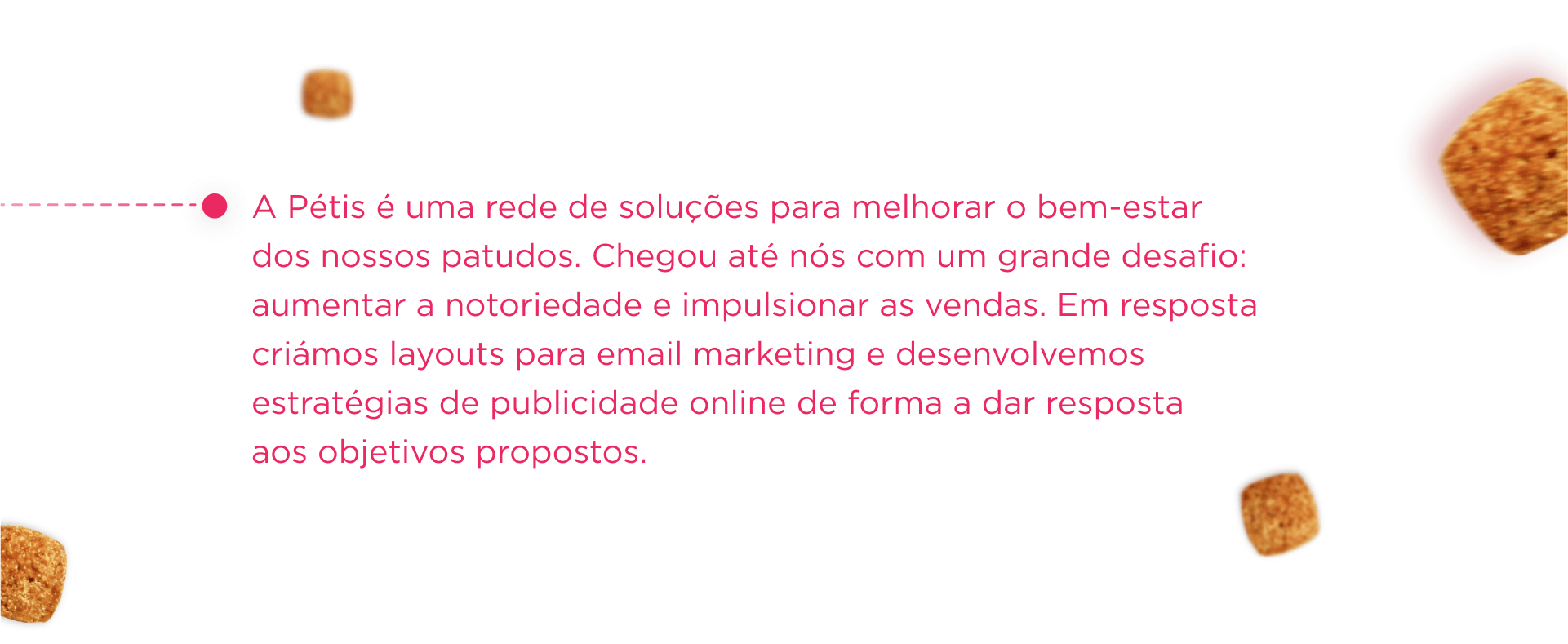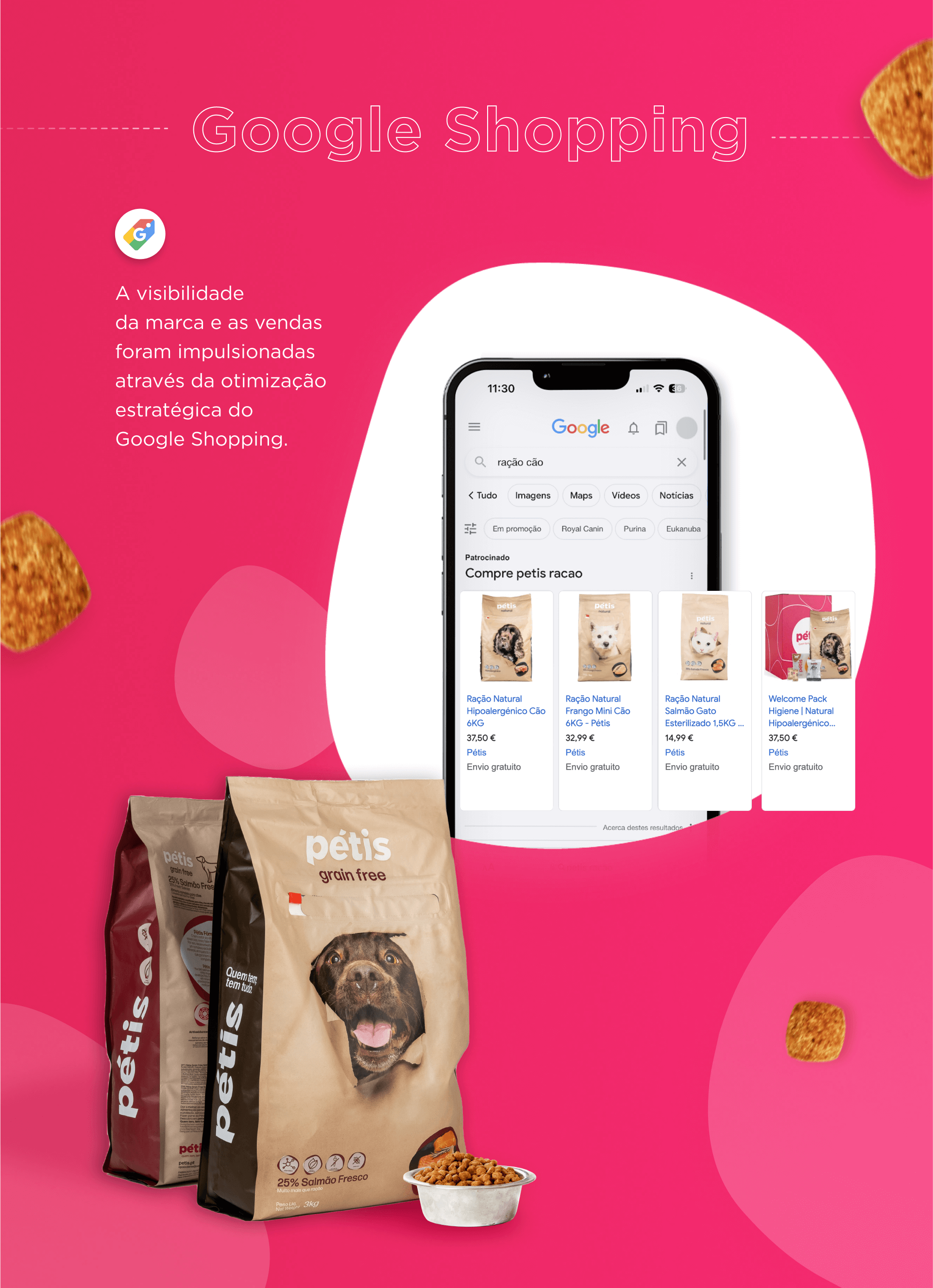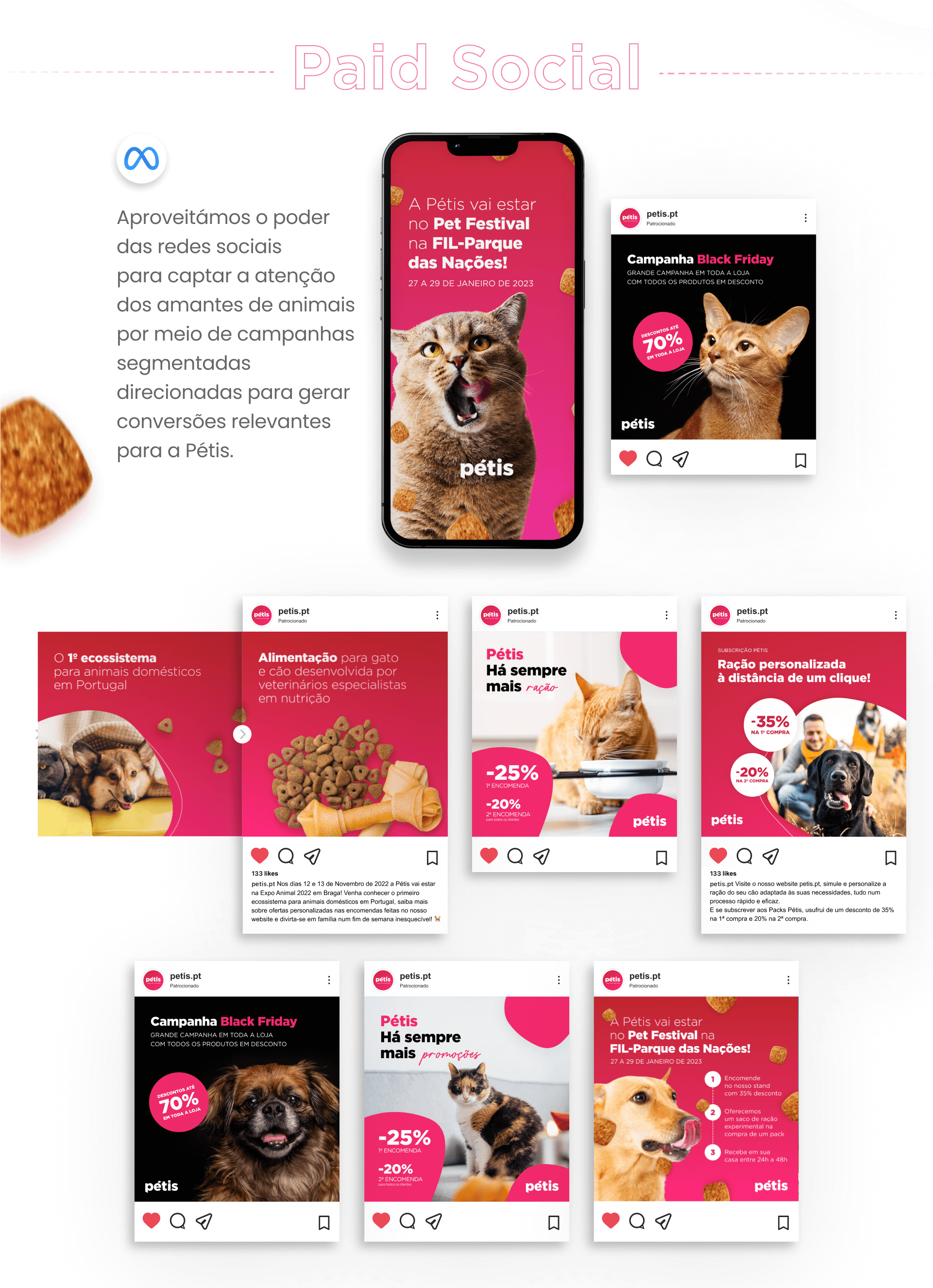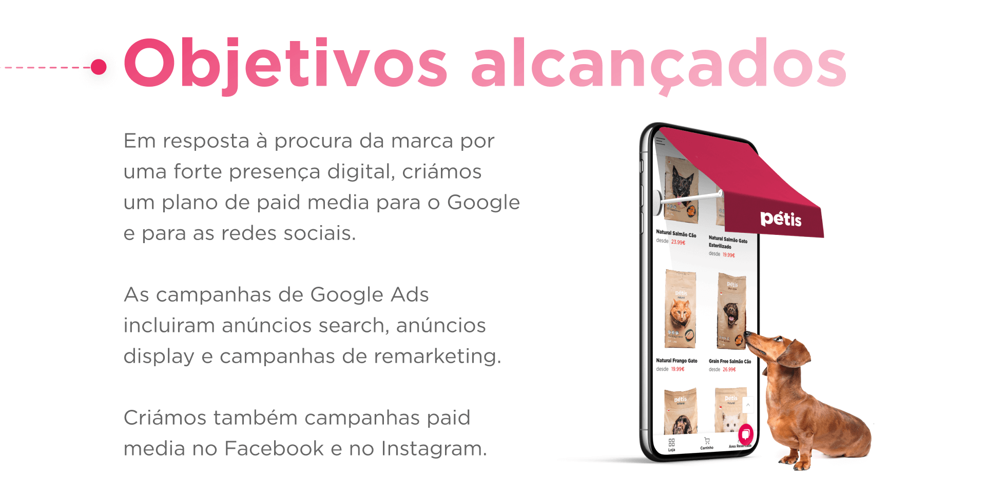 A Pétis chegou até nós com um grande desafio: aumentar a notoriedade e impulsionar as vendas. Arregaçamos as mangas e encaramos o projeto com a missão de ajudar a Pétis a suceder no mundo digital, bem como a proporcionar bem-estar aos animais de estimação. Implementámos email marketing e campanhas de Google Ads e nas redes socias.