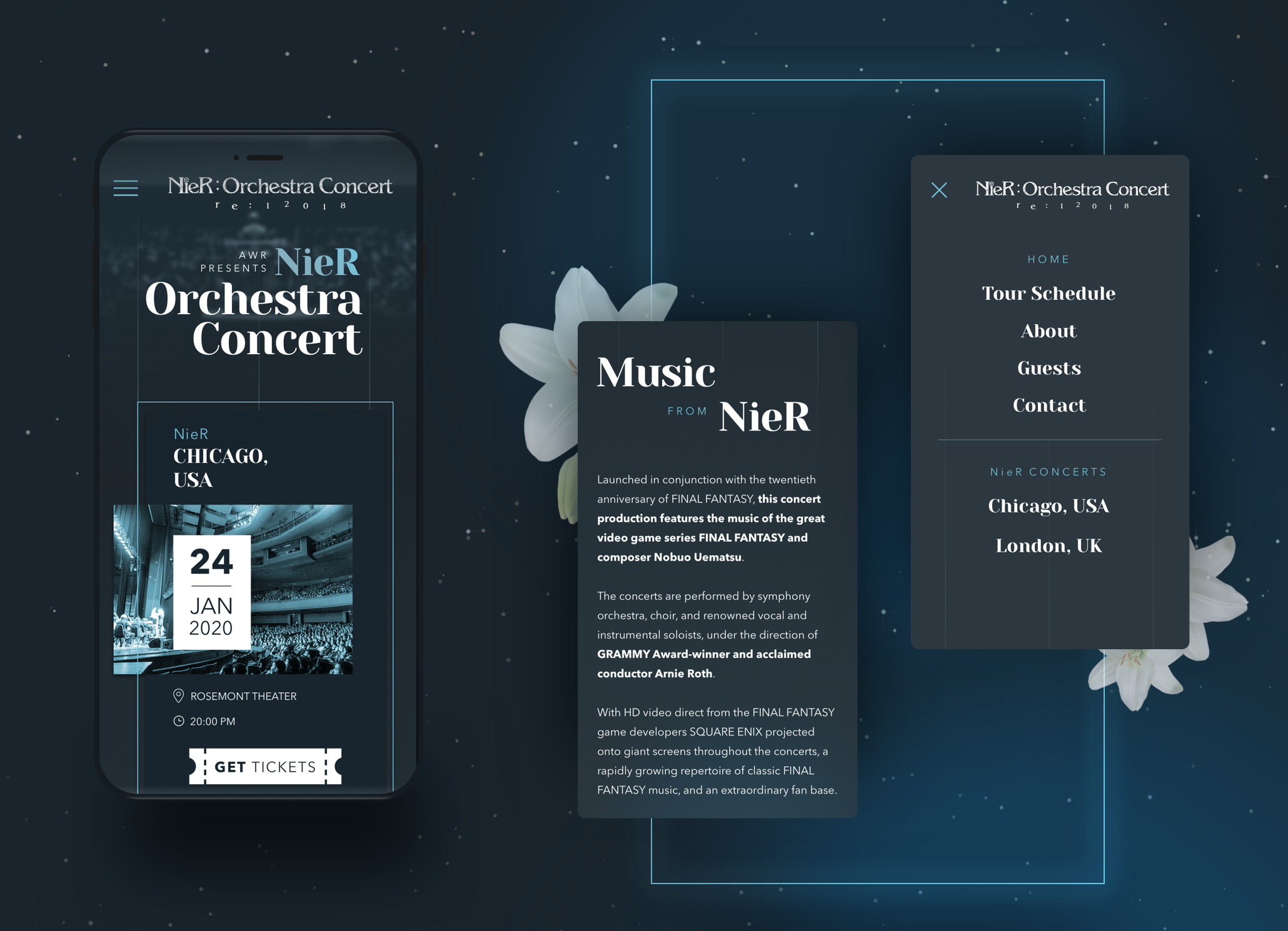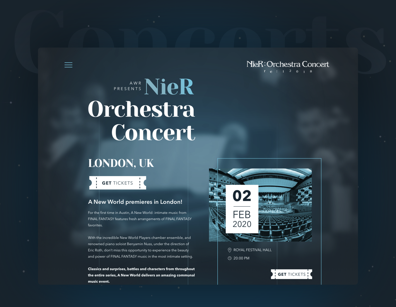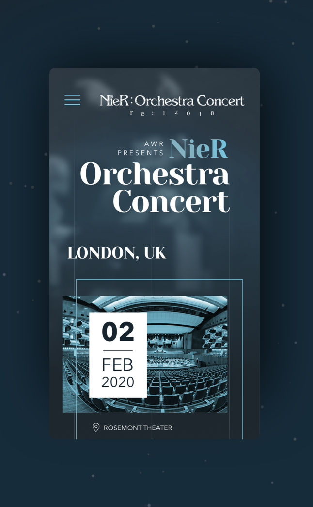 Once again, we had the privilege of working with the producer AWR on the website development of their recent concert "Nier Orchestra Concert" with the soundtrack of the video game "Nier". We created a landing page that informs about the upcoming concerts, based on the videogame’s visual atmosphere and the orchestra, to better represent the experience of the shows.